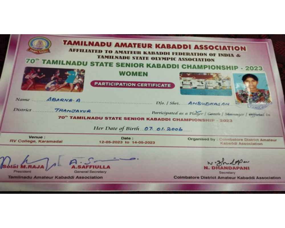 ABARNA A- IInd YEAR B.Sc. FORENSIC SCIENCE PARTICIPATED AT 70TH TAMILNADU STATE SENIOR KABBADI CHAMPIONSHIP – 2023.