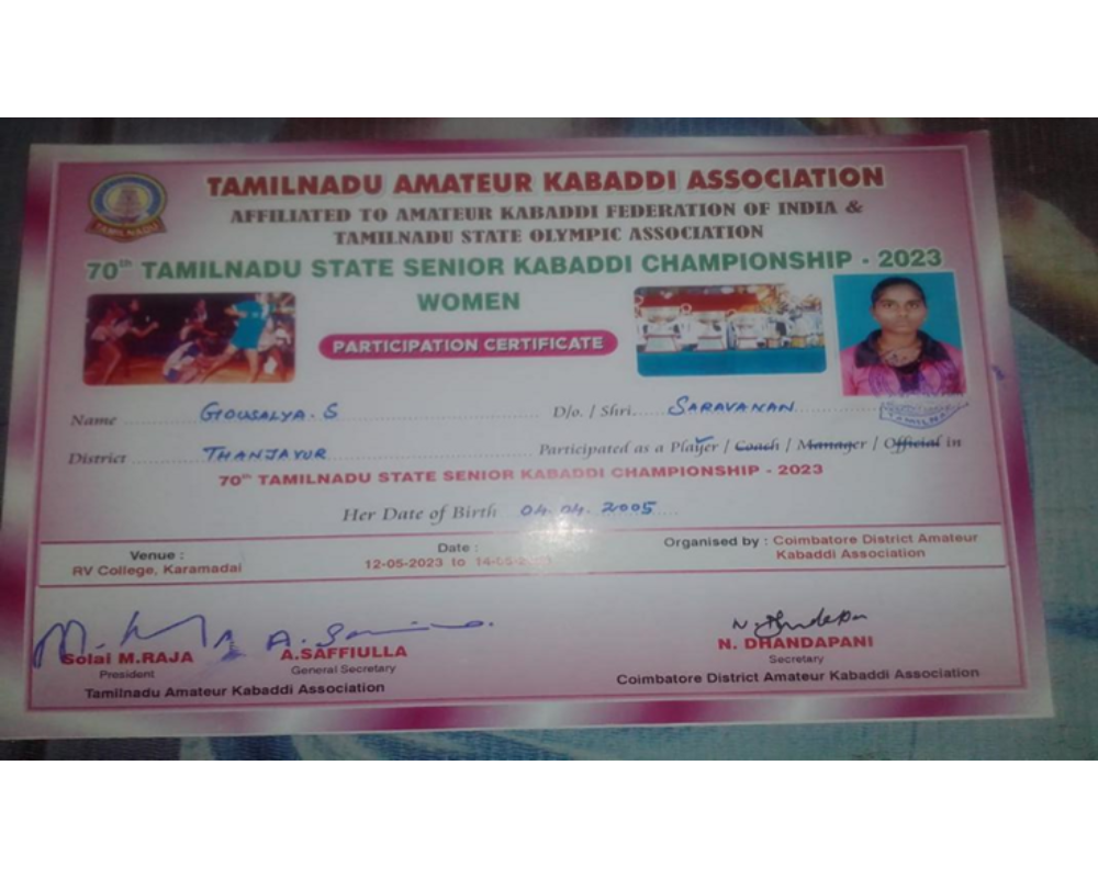 GOUSALYA S - IInd YEAR B.Sc. FORENSIC SCIENCE PARTICIPATED AT 70TH TAMILNADU STATE SENIOR KABBADI CHAMPIONSHIP – 2023.