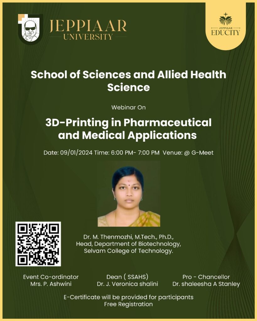 Webinar on 3D Printing in Pharmaceutical and Medical Applications. January 8, 2024 News and Events Webinar on 3D Printing in Pharmaceutical and Medical Applications. PreviousFeel The Visuals NextWebinar Inauguration of RDO & EFIL on 20th February 2025 February 18, 2025 Two days school finishing workshop Breast Cancer Awareness Walkathon November 13, 2024 Breast Cancer Awareness Walkathon Industrial Visit – Ennore Thermal Plant November 13, 2024 Industrial Visit – Ennore Thermal Plant